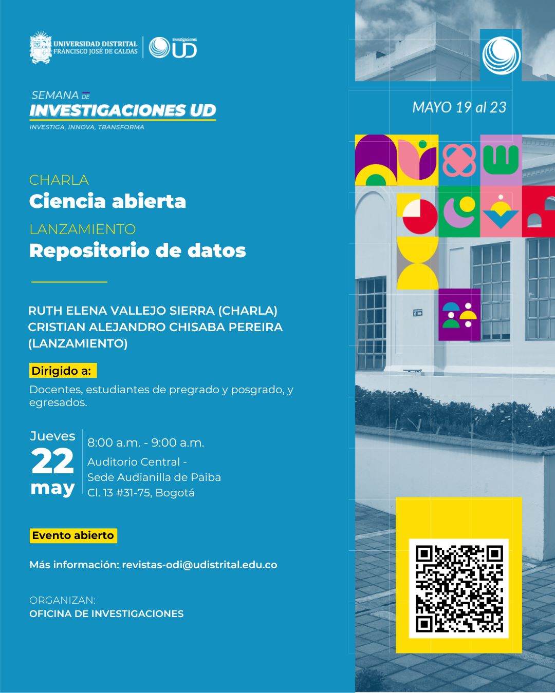En el marco de la Semana de Investigaciones UD, nos complace extender una cordial invitación a la charla “Ciencia abierta” y al lanzamiento del Repositorio de datos, que tendrán lugar el día jueves 22 de mayo de 2025, en el horario de 8:00 a.m. a 9:00 a.m., en el Auditorio Central de la Sede Aduanilla de Paiba (Cl. 13 #31-75, Bogotá).