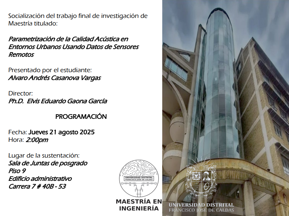 La Maestría en Ingeniería tiene el gusto de invitar a toda la comunidad universitaria a la sustentación del trabajo final de investigación titulado: "Parametrización de la calidad acústica en entornos urbanos usando datos de sensores remotos", presentado por nuestro estudiante: Ing. Álvaro Andrés Casanova Vargas, dirigido por el docente Elvis Eduardo Gaona.