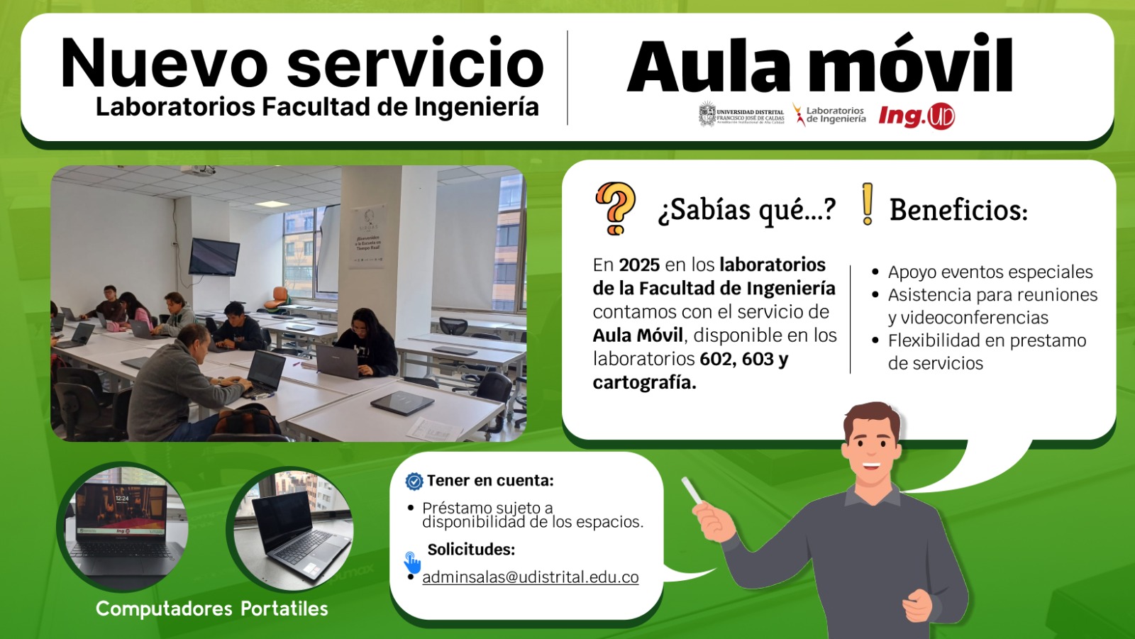 Nos complace informar sobre el nuevo servicio de Aula Móvil, disponible a partir del año 2025 en los laboratorios 602, 603 y Cartografía.