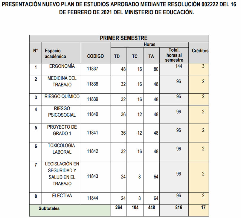 * Primer Semestre: Diecisiete Créditos (17) Equivalente a 8.5 SMMLV