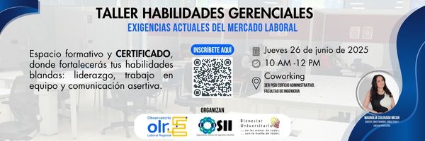 Desde el Observatorio Laboral Regional (OLR) – Nodo UD, en colaboración con Bienestar Universitario y la Organización Semana de Ingeniería Industrial (OSII), tenemos el gusto de invitarte al tercer evento formativo del semestre 🎯 Taller de Habilidades Gerenciales: Exigencias actuales del mercado laboral