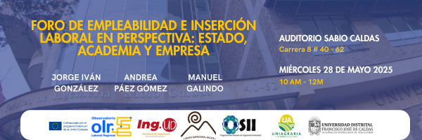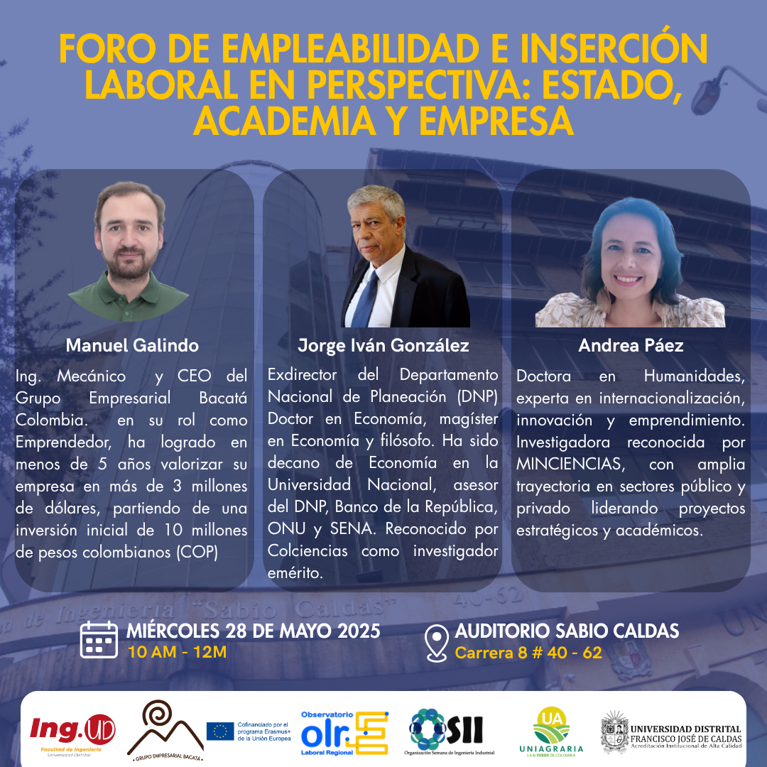 El Observatorio Laboral Regional (OLR) Nodo UD, en articulación con la Organización Semana de Ingeniería Industrial (OSII) y la Facultad de Ingeniería tiene el gusto de invitarte al Foro de Empleabilidad e Inserción Laboral en Perspectiva: Estado, Academia y Empresa, un espacio que reunirá a expertos de alto nivel del sector público, académico y empresarial para compartir sus experiencias, visiones y recomendaciones sobre el mundo laboral actual.