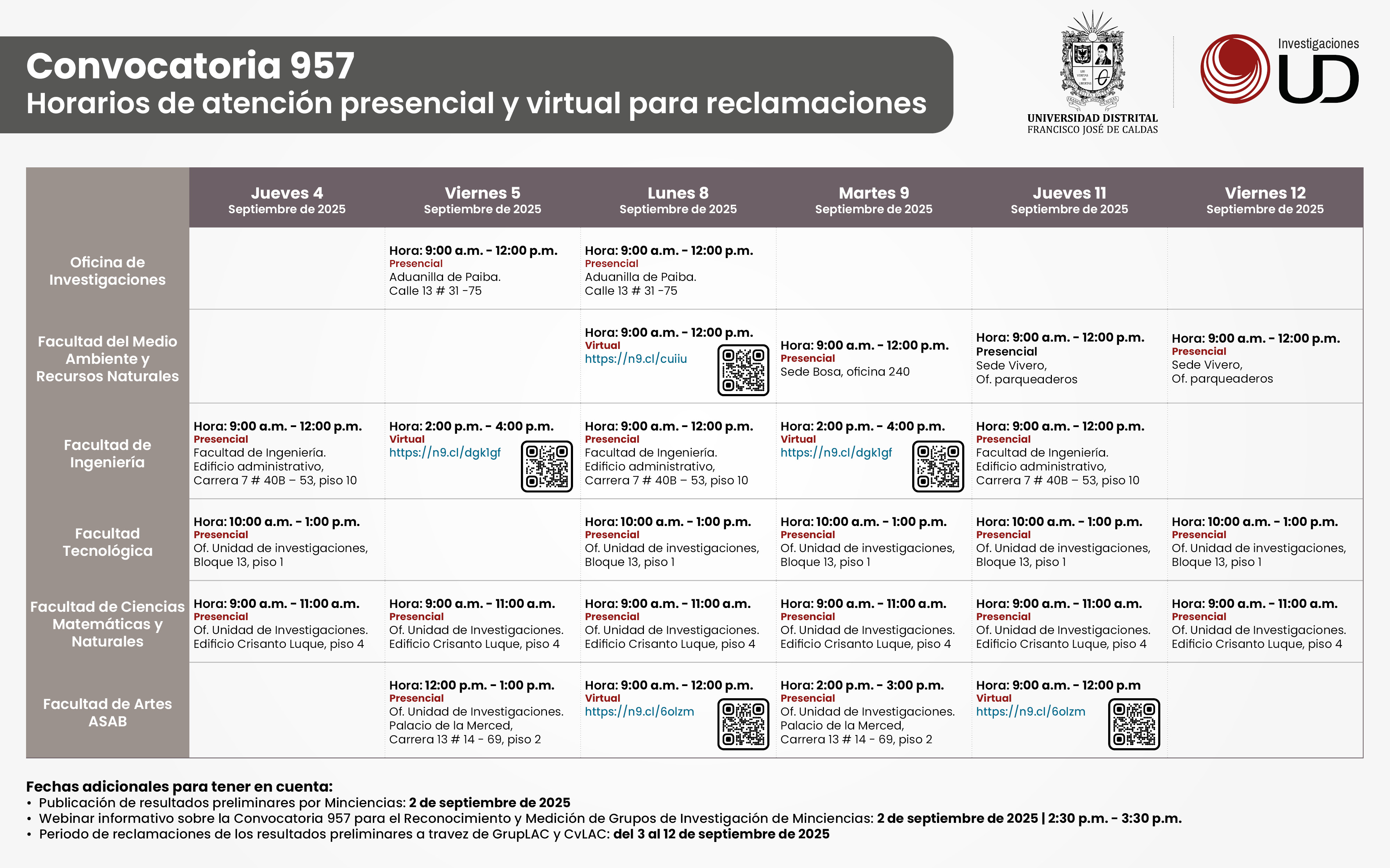 Consulta el cronograma de atención presencial y virtual para las reclamaciones de la Convocatoria 957 de Minciencias.