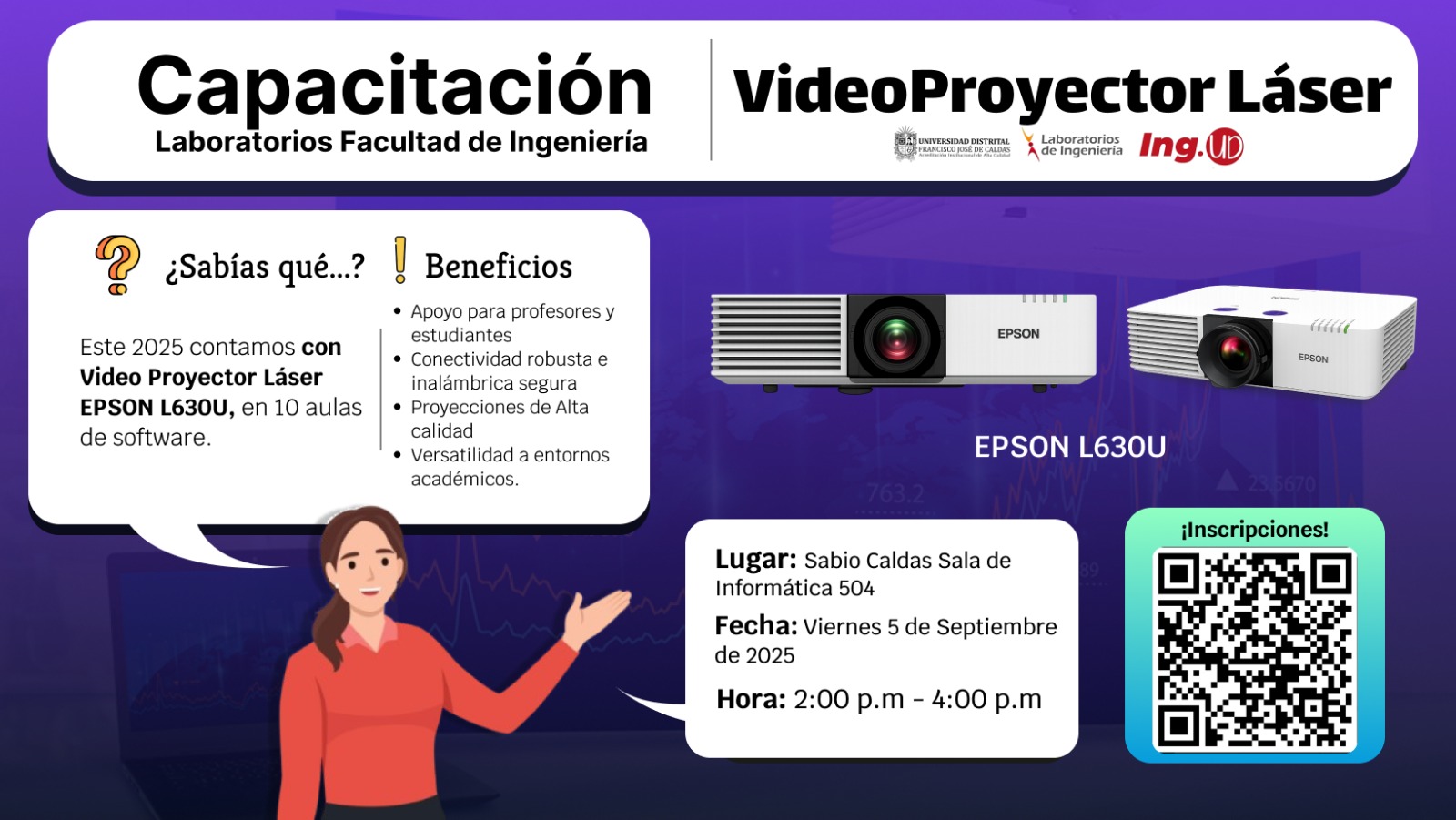 Nos complace invitarlos a la capacitación sobre el uso del Video Proyector Láser EPSON L630U, recientemente instalado en 10 aulas de software de nuestra facultad. Esta capacitación será impartida directamente por el proveedor especializado, quien explicará las funcionalidades, beneficios y mejores prácticas para aprovechar al máximo esta herramienta en sus clases.