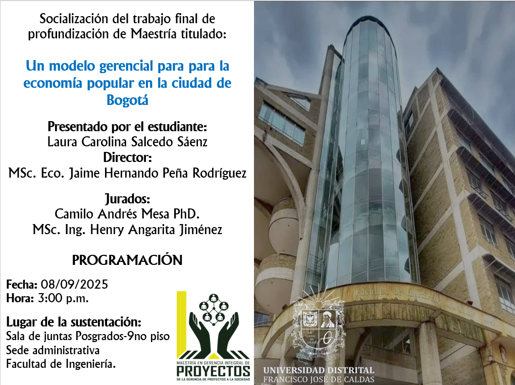 La Maestría en Gerencia Integral de Proyectos tiene el gusto de invitar a toda la comunidad universitaria a la socialización del Informe final de profundización titulado: “Un modelo gerencial para la economía popular en al ciudad de Bogotá” Presentado por nuestro estudiante Laura Carolina Salcedo Sáenz, dirigido por el docente Jaime Hernando Peña Rodríguez.
