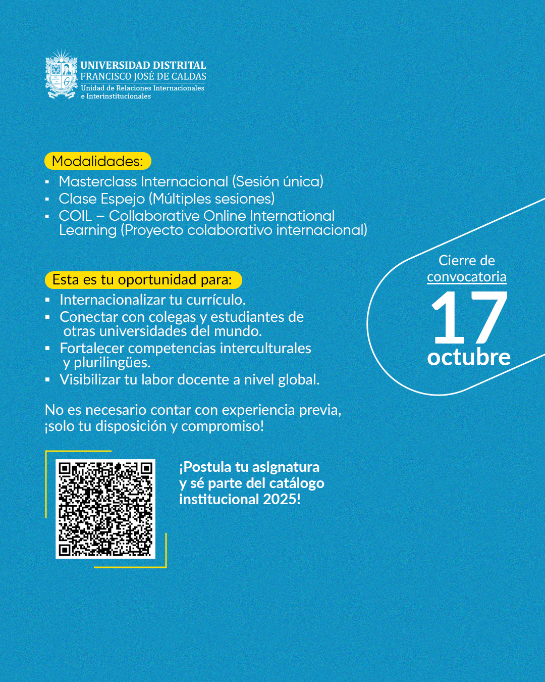 La Unidad de Relaciones Internacionales e Interinstitucionales – URELINTER abre la convocatoria del Banco de Aulas Internacionalizadas 2025 para postular tu asignatura en alguna de estas modalidades:
